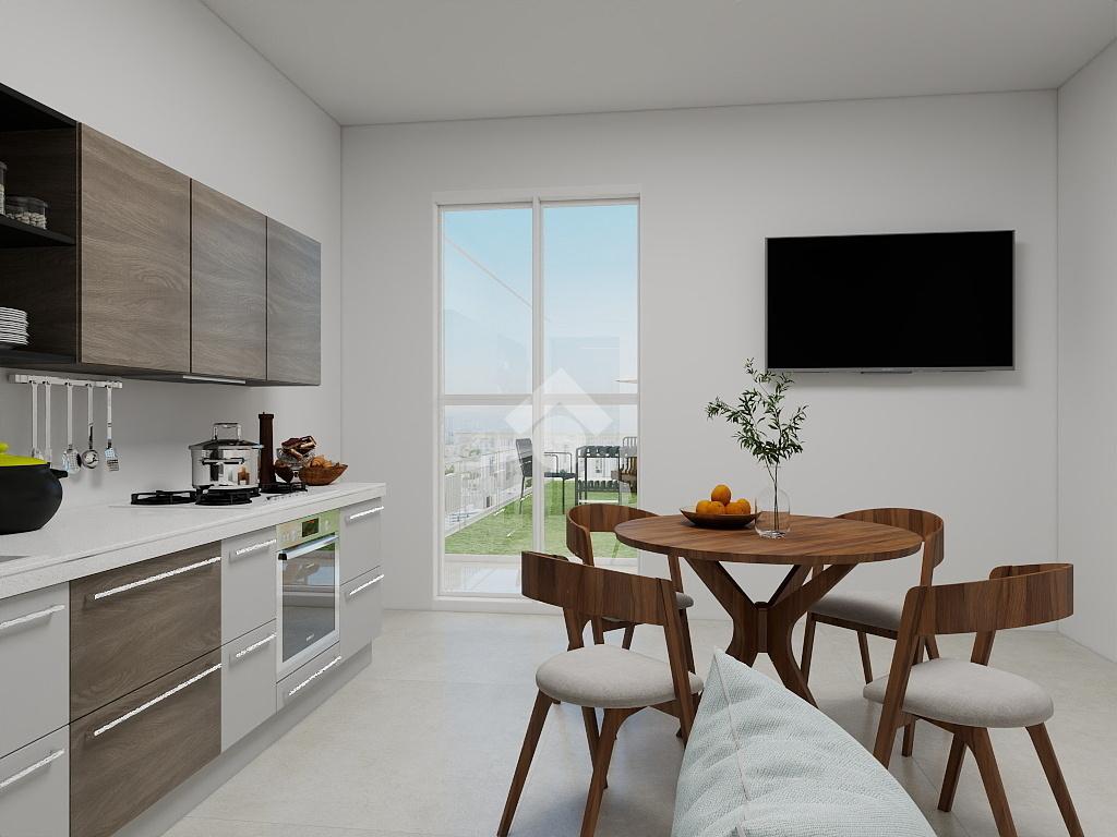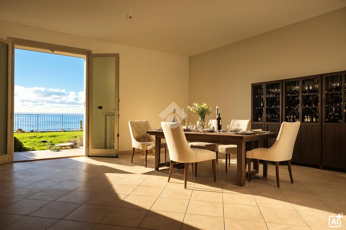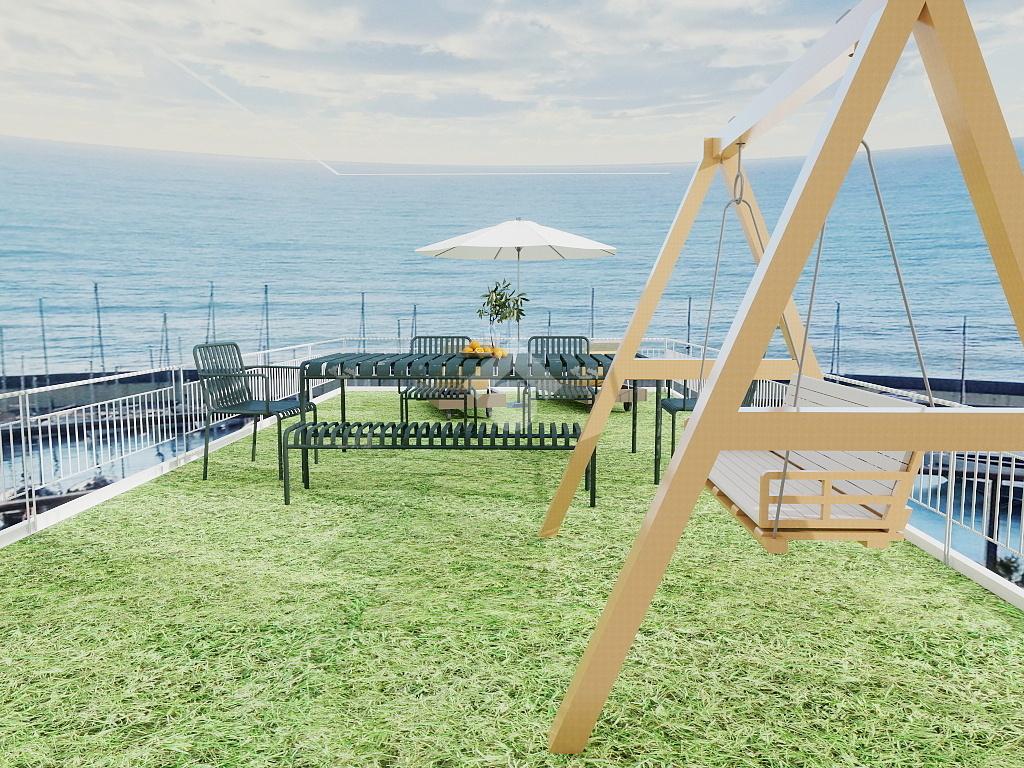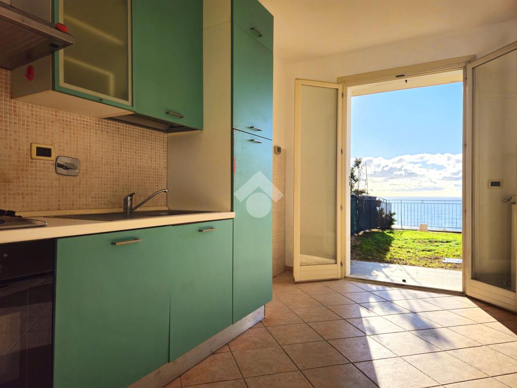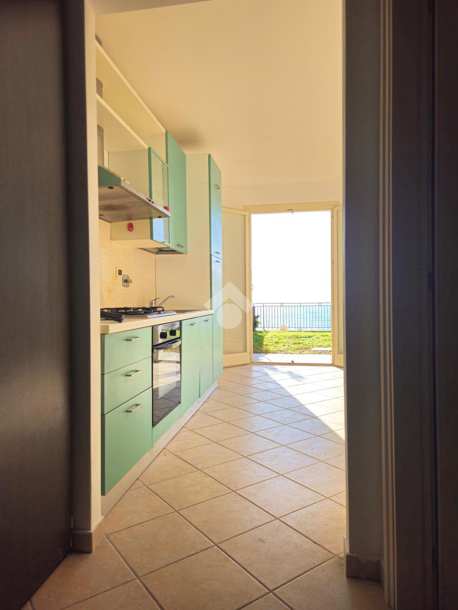 L'alloggio è composto da un disimpegno di ingresso, un' ampia zona giorno-notte rivolta a sud con portafinestra che accede al terrazzo-giardino di 45 mq con vista mare frontale, ed un bagno finestrato con box doccia.